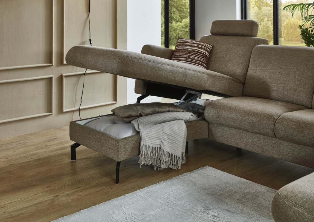 Stoff: 94% Polyester, 6% Nylon, Farbe mandel, Doppelsteppnaht ohne Kontrastnaht, Sitz Kaltschaum, Metallfuß schwarz, Sitzhöhe ca. 49 cm, Sitztiefe ca. 51 cm, bestehend aus: Ecksofa, Armteil links, Rücken unecht, Stellmaß 170x307x190 cm