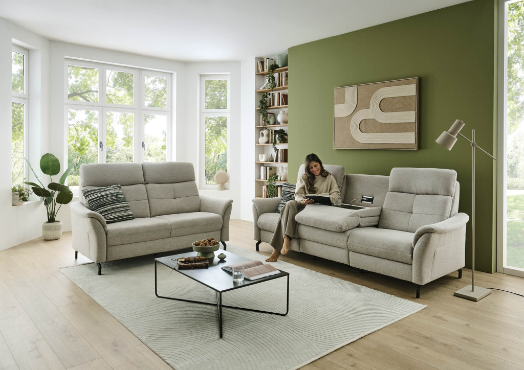 Stoff: 94% Polyester, 6% Nylon, Farbe beige, Kappnaht ohne Kontrast, Sitz Federkern, Metallfuß schwarz, Sitzhöhe 46 cm, Sitztiefe 54 cm, mit Kopfteilverstellung, bestehend aus: 2,5-Sitzer, BHT 174/104/93 cm, 3-Sitzer, Rücken unecht, BHT 241/104/93 cm