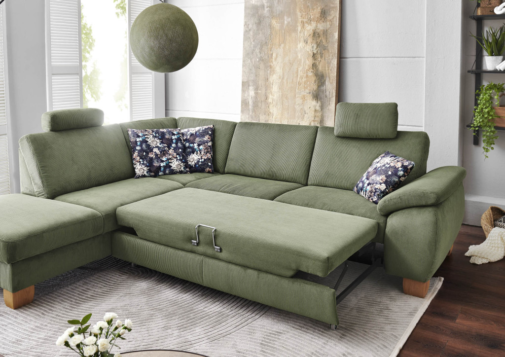 Feincord, NS: 95 Polyester, 5% Nylon, GS: 100% Polyester, Farbe forest, Sitz Federkern, Rücken Nessel, Fuß Holzfuß Wildeiche, Naht Doppelstepp mit Kontrastfaden, bestehend aus:1,5-Kombielement Hocker links, BHT ca. 236/??? cm, 3-Sitzer Armlehne rechts, BHT ca. ??? cm, Stellmaß ca. 236x281 cm