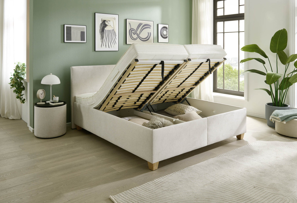 Stoff, Farbe salbei, Füße Holz Buche natur, 10 cm, Kopfteil, Unterbau, Lattenrahmen links + rechts, Matratze links 5-Zonen Taschenfederkern-Matratze H2, Matratze rechts 5-Zonen Taschenfederkern-Matratze H3, Bezug Drell, geteilt, Liegefläche 180 x 200 cm