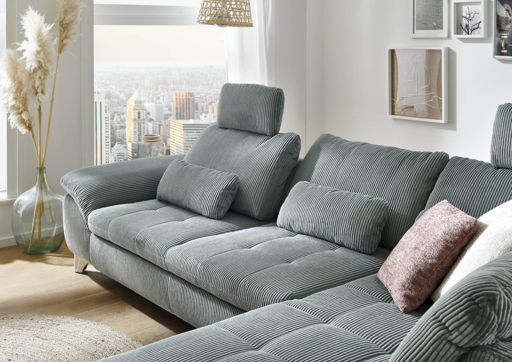 Stoff Cord, Farbe aqua, Rücken echt, Sitz Schaum, Metallfuß hochglänzend, Sitzhöhe 45cm, Sitztiefe 67cm, bestehend aus: