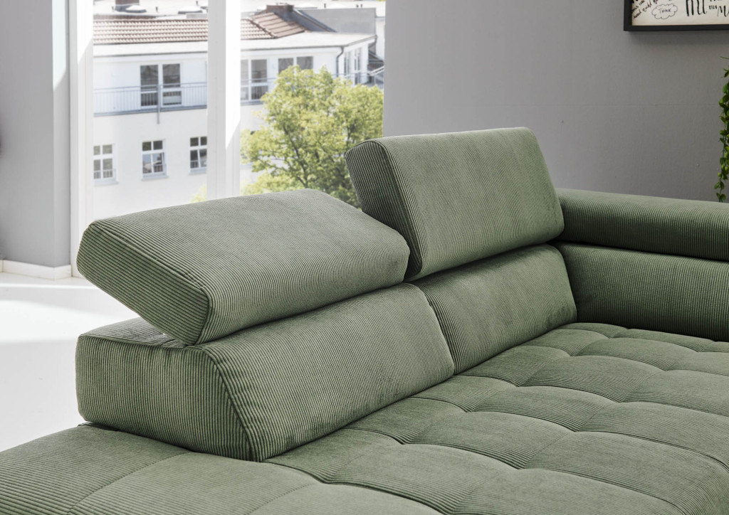 Stoff Feincord (SG1), Farbe forest, Kaltschaum, Metallfüße schwarz, Sitzhöhe 44 cm, Sitztiefe 67 cm 1XKOGL KV - Kombielement gerade mit Anstellhocker links, Kopfpolsterverstellung inklusive, BHT 116/76/214 cm 1,5XXLR KV - 1,5-Sitzer XXL, Armlehne rechts, Kopfpolsterverstellung inklusive, BHT 145/76/116 cm Schenkelmaß ca. 261x214 cm