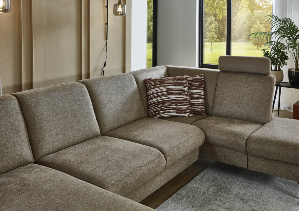 Stoff: 94% Polyester, 6% Nylon, Farbe mandel, Doppelsteppnaht ohne Kontrastnaht, Sitz Kaltschaum, Metallfuß schwarz, Sitzhöhe ca. 49 cm, Sitztiefe ca. 51 cm, bestehend aus: Ecksofa, Armteil links, Rücken unecht, Stellmaß 170x307x190 cm