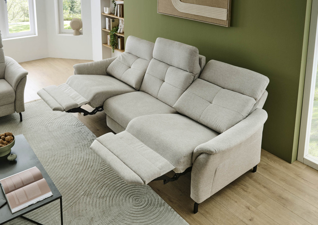 Stoff: 94% Polyester, 6% Nylon, Farbe beige, Kappnaht ohne Kontrast, Sitz Federkern, Metallfuß schwarz, Sitzhöhe 46 cm, Sitztiefe 54 cm, mit Kopfteilverstellung, bestehend aus: 2,5-Sitzer, BHT 174/104/93 cm, 3-Sitzer, Rücken unecht, BHT 241/104/93 cm