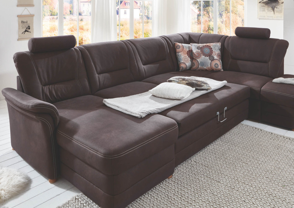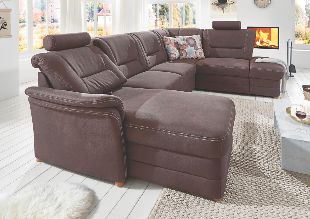 Microfaser geprägt, Nutzschicht: 100% Polyester, Grundschicht: 100% Polyester, Farbe braun, Sitz Federkern, Kontrastnaht Doppelsteppnaht beige, Buche Holzfuß erlefarbig, Sitzhöhe 46 cm, bestehend aus:
