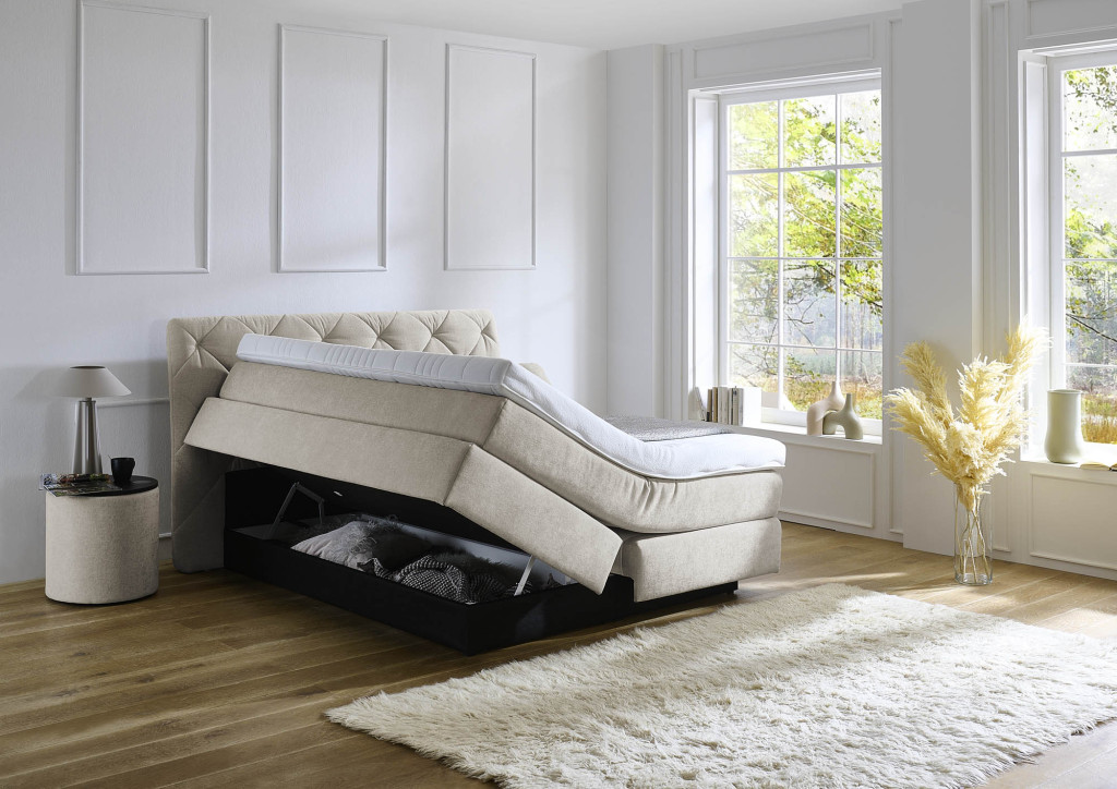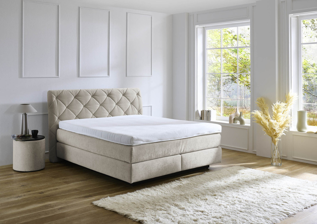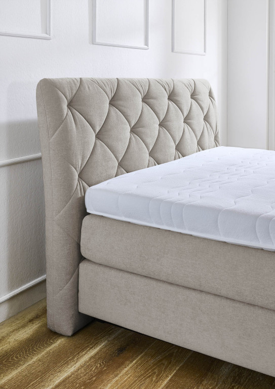 Bezug variabel, Farbe natur, Füße Bettsockel schwarz, Unterbau Taschenfederkern, Rücken unecht, 2 x 7-Zonen-Tonnentaschenfederkern-Matratze MS 358, Härtegrad 2/Härtegrad 3, Stoffbezug im Ganzen, Topper Kaltschaum, Bezug im Ganzen, ca. 180x200 cm