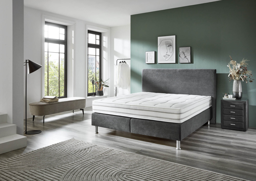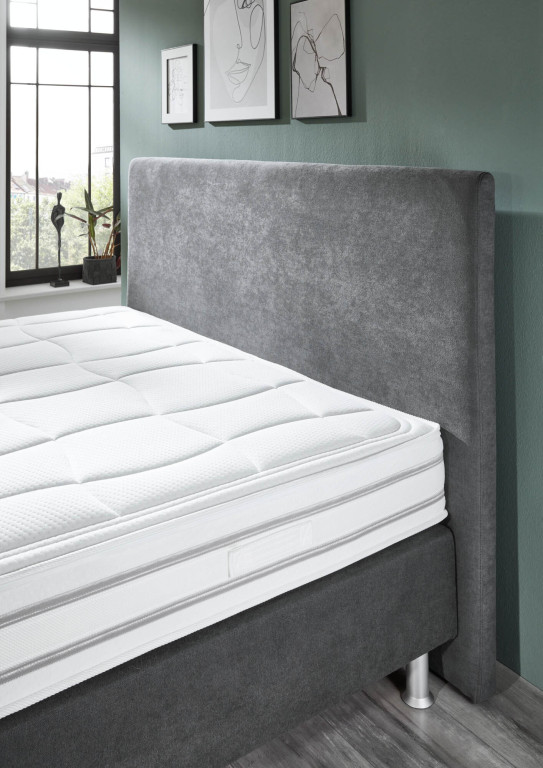 Microfaser, Nutzschicht 92 % Polyester, 8 % Nylon, Grundschicht 100 % Polyester, Farbe anthrazit, Kopfteil Rücken unecht, Kunststofffüße alufarbig, Matratzen 7-Zonen Liegekomfort mit Comfort Schaumauflage H2/H3 & H4/H5, Drellbezug einteilig, Unterbau Bonellfederkern, Liegefläche ca. 180x200 cm, BHT ca. 190/125/256 cm