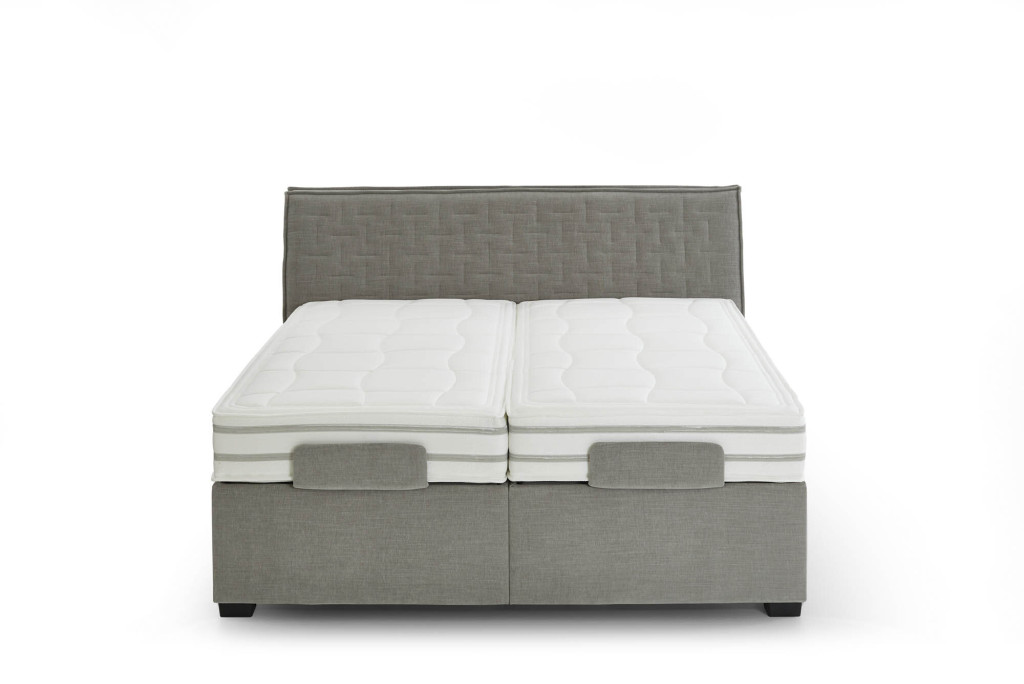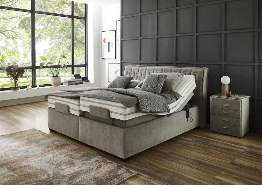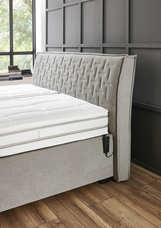 Chenille, Nutzschicht 100 % Polyester, Farbe silver, Kopfteil Rücken unecht, Kunststofffüße schwarz, Matratzen 7-Zonen Taschenfederkern H2/H3, Unterbau Taschenfederkern mit motorischer Verstellung von Kopf-und Fußteil, Liegefläche ca. 180x200 cm, BHT ca. 193/108/222 cm
