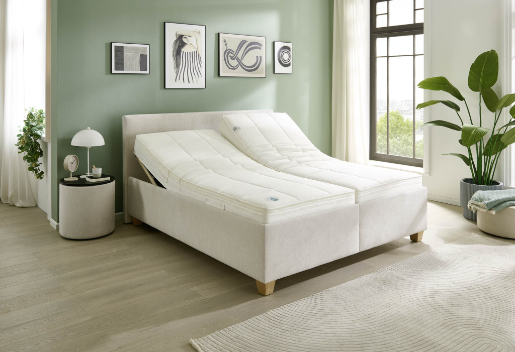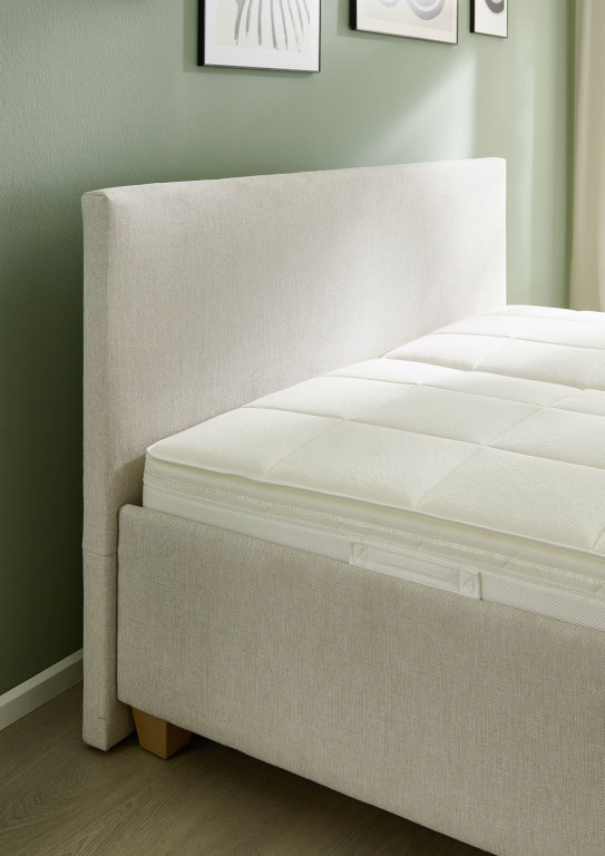 Stoff, Farbe salbei, Füße Holz Buche natur, 10 cm, Kopfteil, Unterbau, Lattenrahmen links + rechts, Matratze links 5-Zonen Taschenfederkern-Matratze H2, Matratze rechts 5-Zonen Taschenfederkern-Matratze H3, Bezug Drell, geteilt, Liegefläche 180 x 200 cm