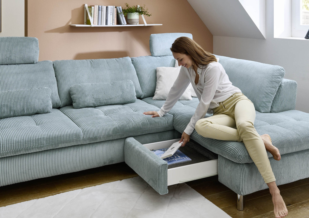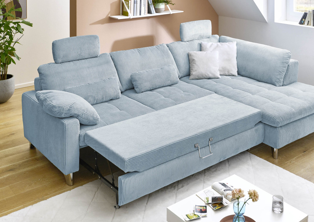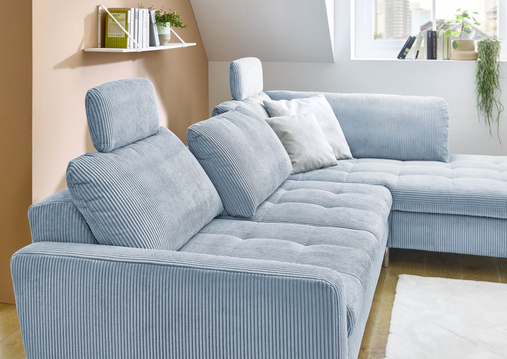 Stoff Cord (SG2), Farbe aqua, Polyätherschaum auf Wellenfedern, Metall-Winkelfüße glänzend, Sitzhöhe ca. 45 cm 3L - 3-Sitzer, Armlehne links, BHT ca. 175/84/112 cm 2KOR - 2-Sitzer Kombielement mit Anstellhocker rechts, BHT ca. 113/84/197 cm Stellmaß ca. 288x197 cm