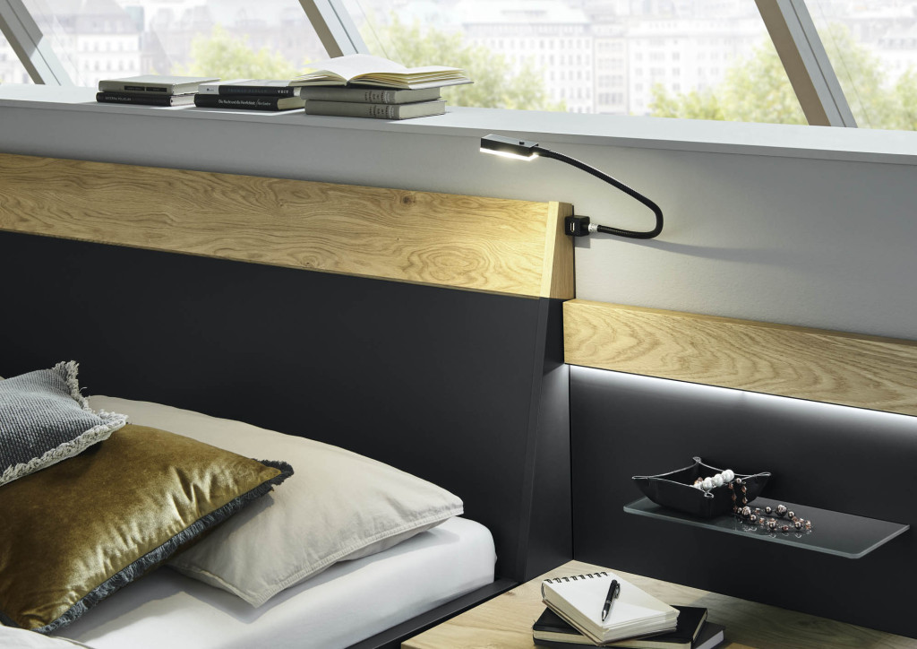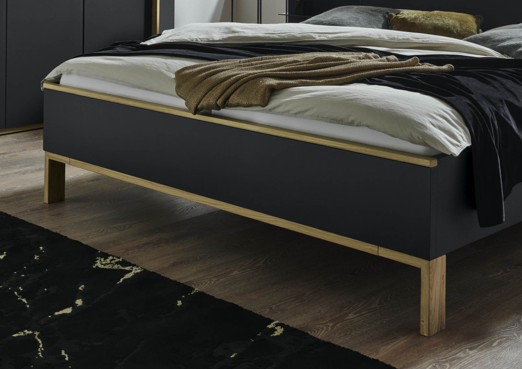 Doppelbett in Luxushöhe, Bettseitenhöhe 48,6 cm, Holzkopfteil in Lack Basalt mit Absetztung Balkeneiche, schwebenes Fußteil, Liegefläche 180x200 cm