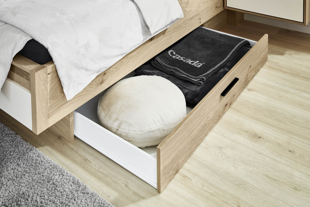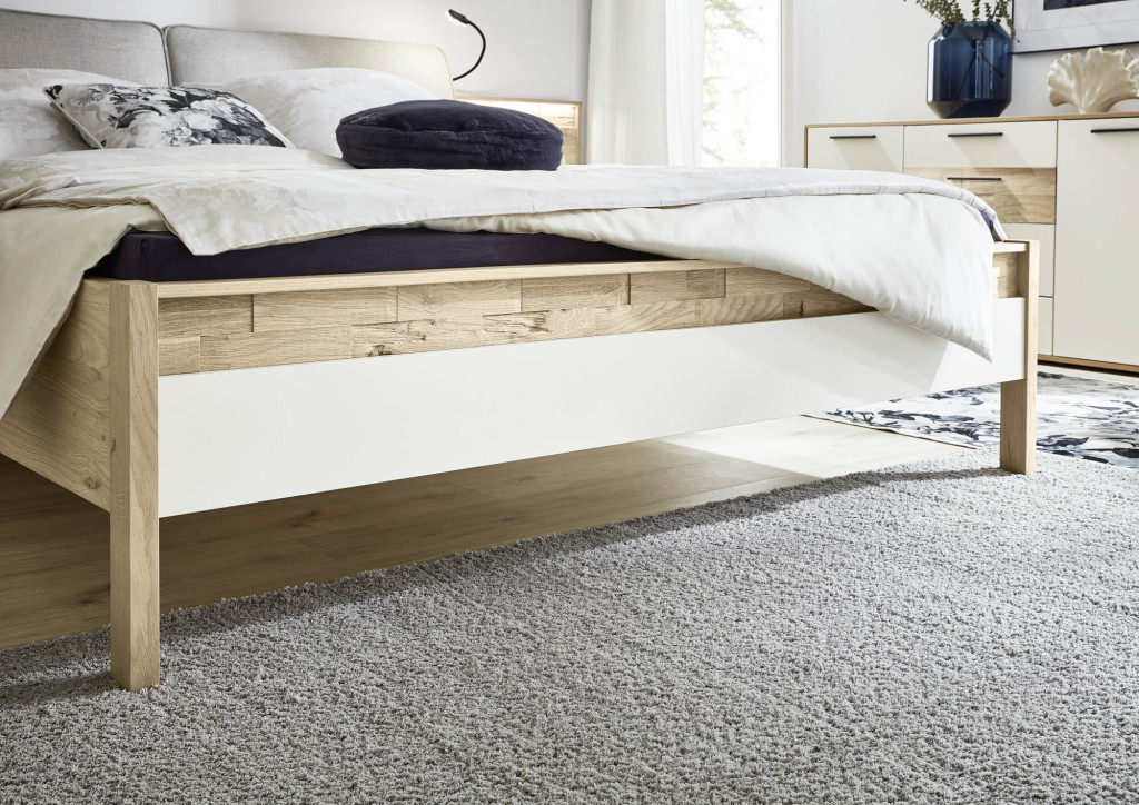 Korpus Balkeneiche furniert, Front Lack Sand, mit Bauchbinde Spaltholz, bestehend aus: