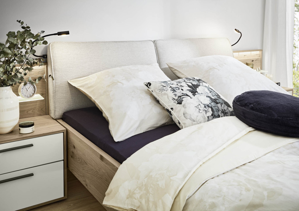 Doppelbett in Luxushöhe, Bettseitenhöhe 48,4 cm, Polsterkopfteil, Farbe Beige, Stollenfußteil mit Spaltholzeinlage, Liegefläche ca. 180x200 cm