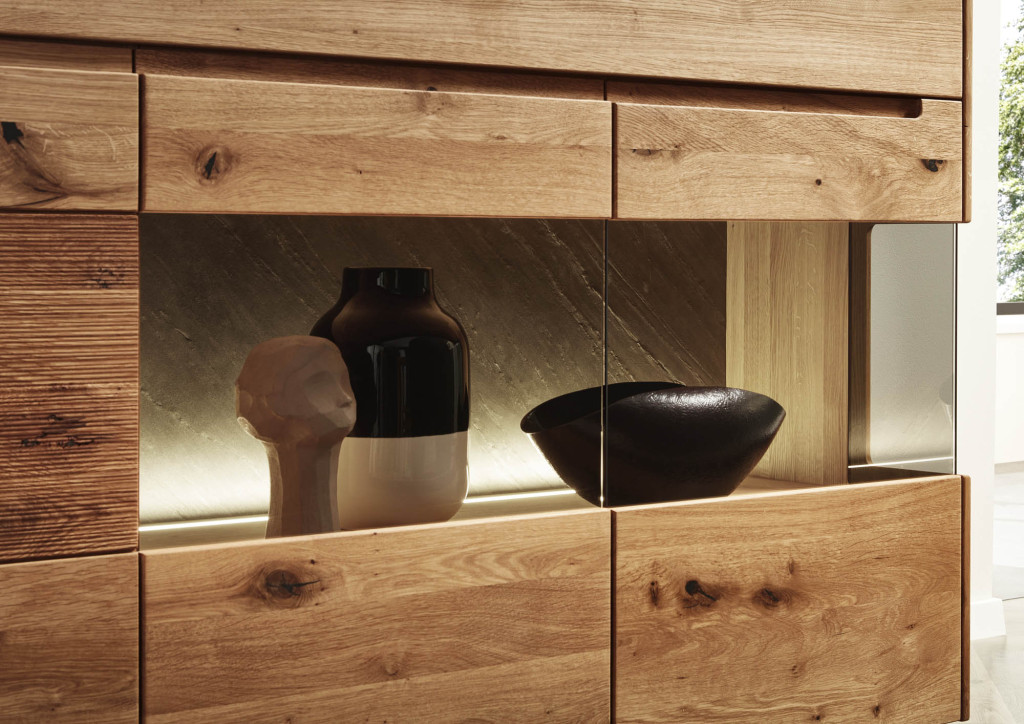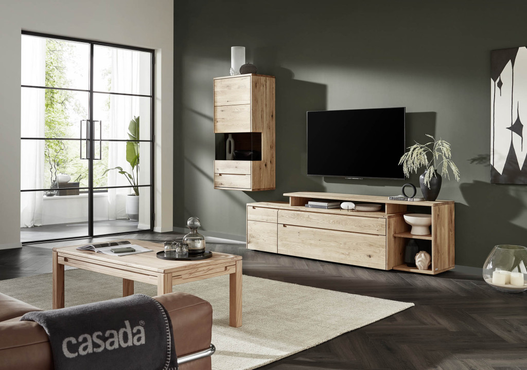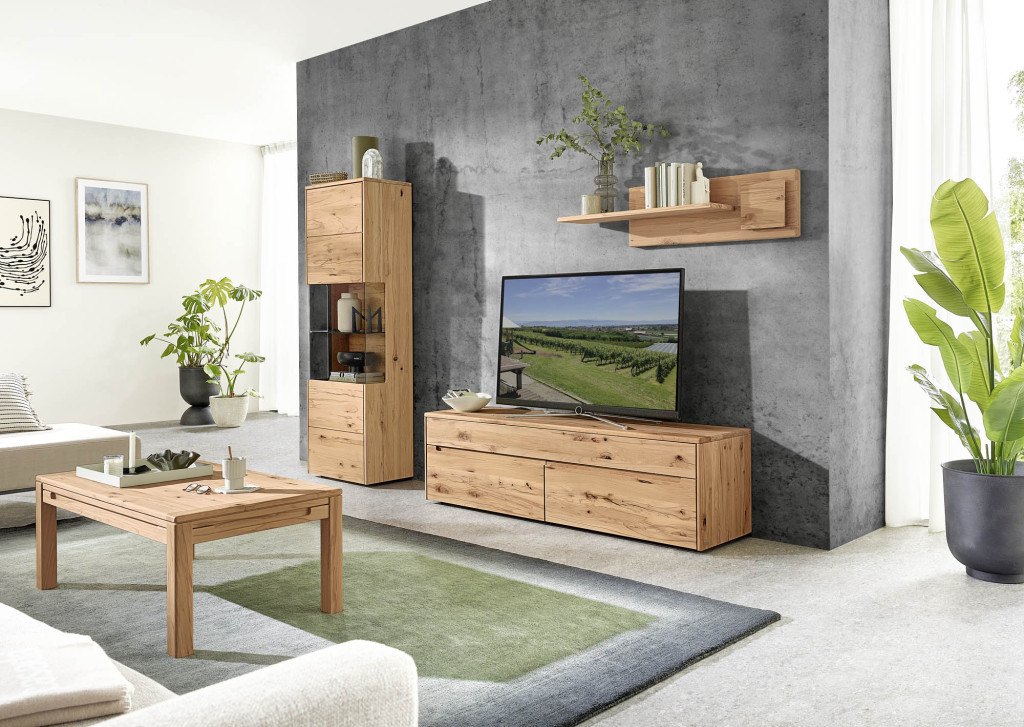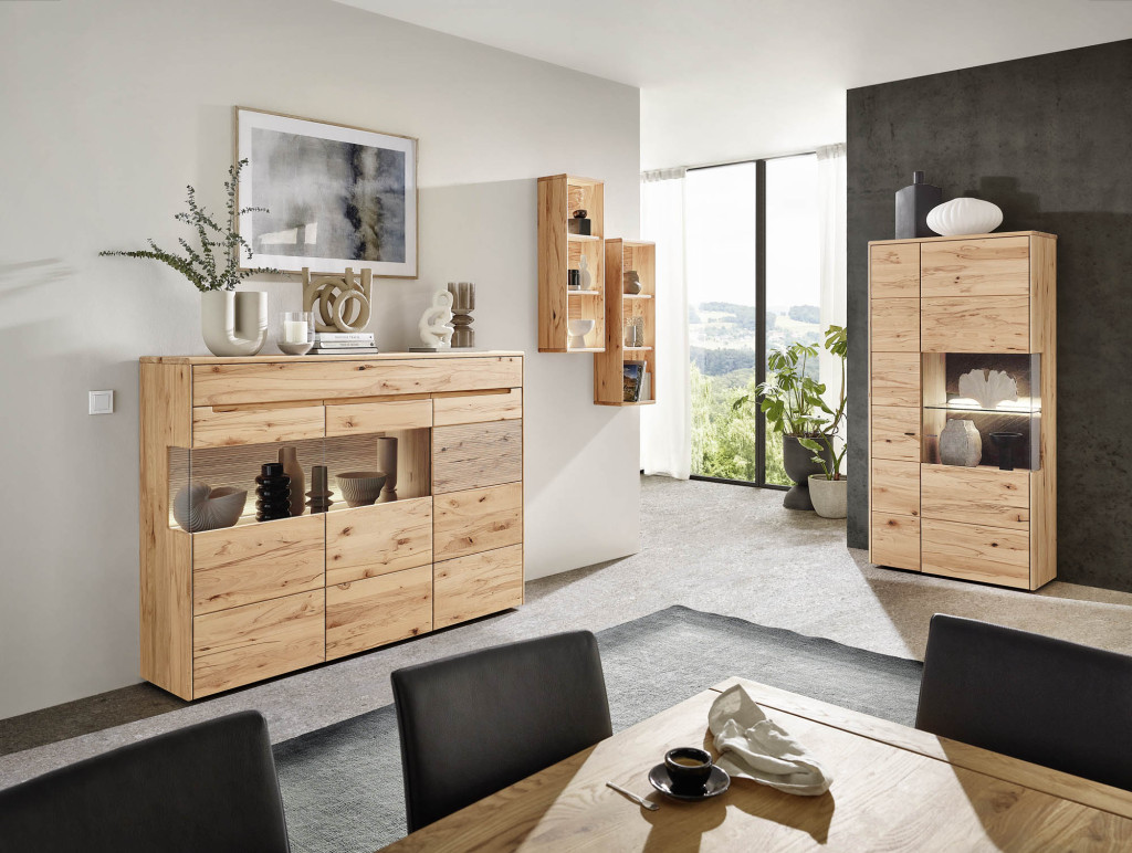 Aslbuche massiv, bianco geölt, bestehend aus: Vitrine, 1 Holz-/Glastür, Anschlag links, Seitenverglasung, 4 Holzböden, 1 Glasboden, BHT ca. 64,4/197,0/39,5 cm, Lowboard, 1 Schubkasten oben mit Doppelzarge, 2 Klappen unten, BHT ca. 184,4/53,0/47, 1 cm, Wandboard/Hängepaneel, Holzpaneel, 1 Ablageboden, BHT ca. 126,0/31 ,6/26,5 cm, Gesamtmaß BHT ca. 300/197/47,1 cm, inklusive 25 cm Typenabstand
