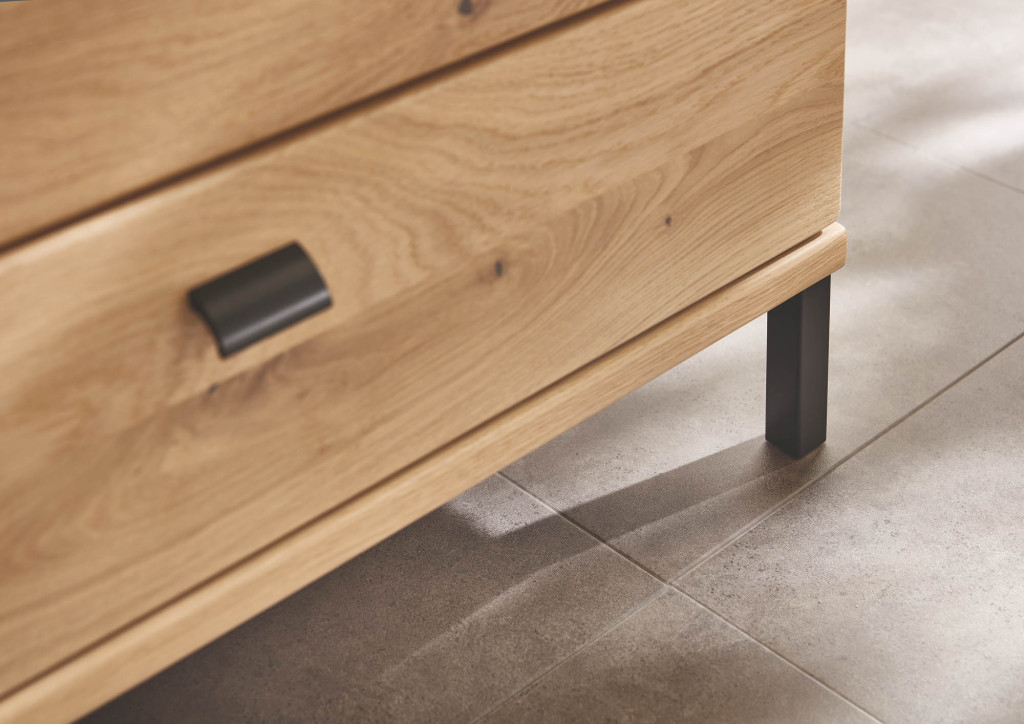 Front Asteiche massiv, Korpus Asteiche furniert, Glasfront klarglas mit schwarzem Alurahmen, Griff schwarz matt, Füße schwarz matt, bestehend aus: