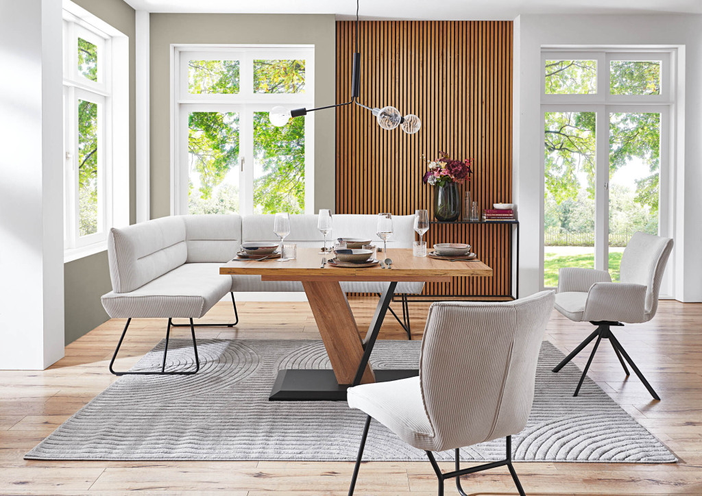 Die Trend-Eckbank im Cordbezug ist ein stilvolles und komfortables Möbelstück, das sich perfekt für Ihr Esszimmer oder Ihre Küche eignet. Mit ihrem eleganten Design und der hochwertigen Verarbeitung wird sie zum absoluten Highlight in jedem Raum. Der Bezug ist in großer Auswahl wählbar und verleiht der Eckbank eine moderne und zugleich gemütliche Ausstrahlung. Das Gestell aus schwarzem Eisen sorgt für die nötige Stabilität und Standfestigkeit. Es unterstreicht zudem den modernen Look der Eckbank und fügt sich nahtlos in jedes Einrichtungskonzept ein. Für maximalen Sitzkomfort ist die Trend-Eckbank mit einem Federkern ausgestattet. Dieser passt sich optimal an Ihren Körper an und ermöglicht so ein angenehmes und entspanntes Sitzen – auch über längere Zeiträume hinweg. Überzeugen Sie sich selbst von der hohen Qualität und dem ausgezeichneten Komfort dieser Eckbank.