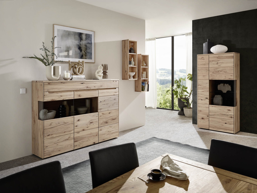 Astbuche massiv, bianco geölt, PG1, Kombination V13401, bestehend aus: 134312 - Vitrine, 1 Holz-/Glastür, Anschlag links, Seitenverglasung, 4 Holzböden, 1 Glasboden, BHT ca. 64,4/197,0/39,5 cm 134610 - Lowboard, 1 Schubkasten oben mit Doppelzarge, 2 Klappen unten, BHT ca. 184,4/53,0/47, 1 cm, 134890 - Wandboard/Hängepaneel, Holzpaneel, 1 Ablageboden, BHT ca. 126,0/31 ,6/26,5 cm Gesamtmaß BHT ca. 300/197/47,1 cm, inklusive 25 cm Typenabstand