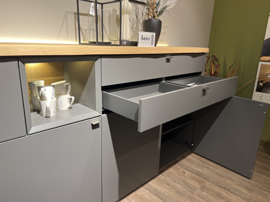 SideboardAusf. Lack schiefergrau matt Eiche rustico hell geöltB/H/T ca. 180/108/43 cminklusive- Beleuchtung - Ambiente - Beleuchtung- Trafo zum Abholpreis