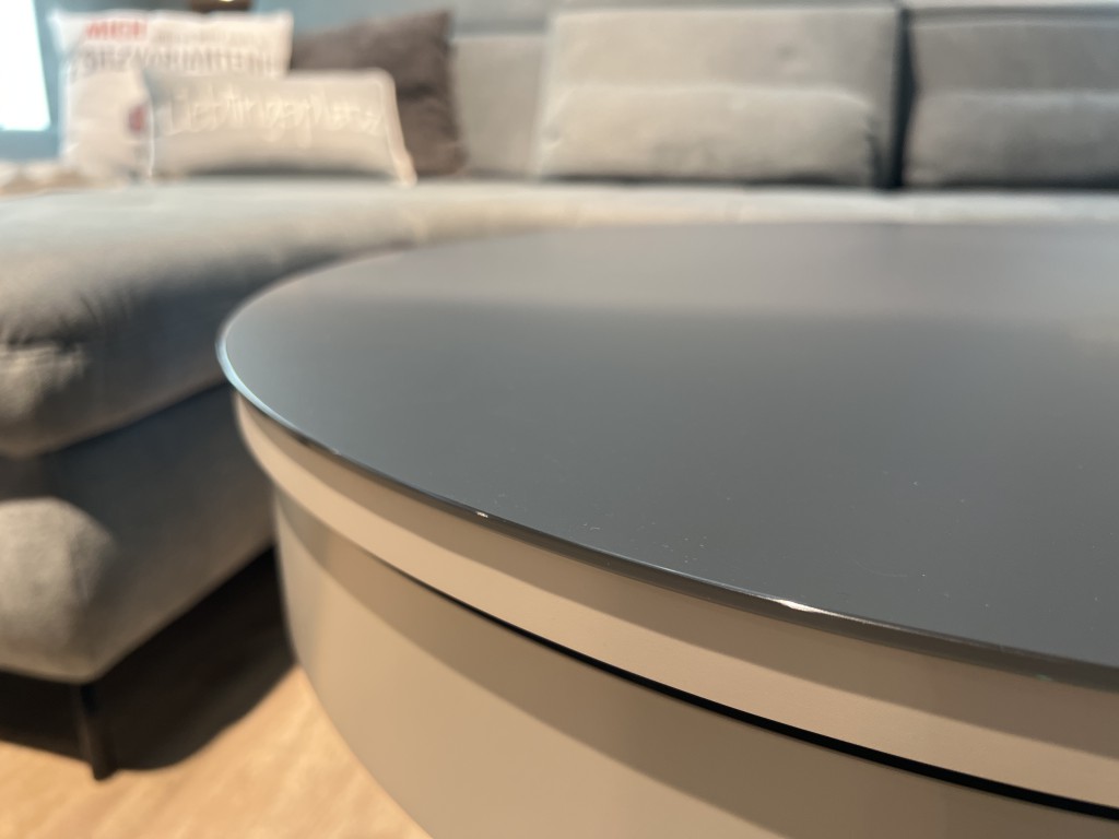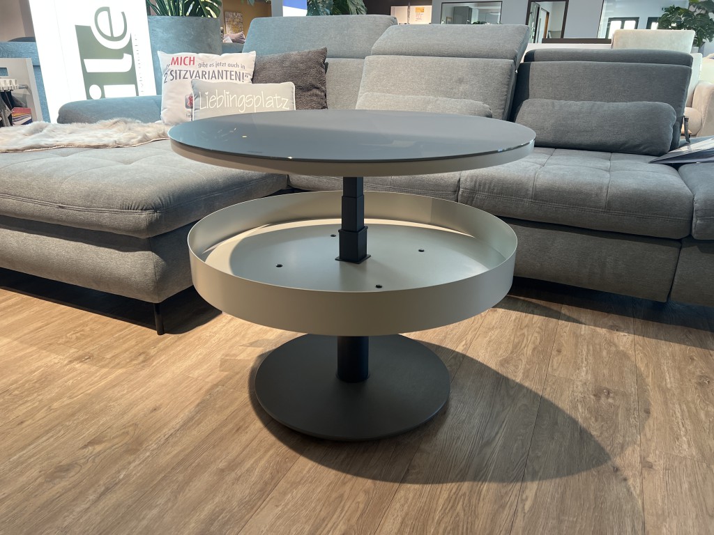 Couchtisch mit Lift Ausf. Platte Glas Satinato umbragrauGestell anthrazit-metallic lackiertDurchmesser 75 cm H: 44 - 62 cmzum Abholpreis